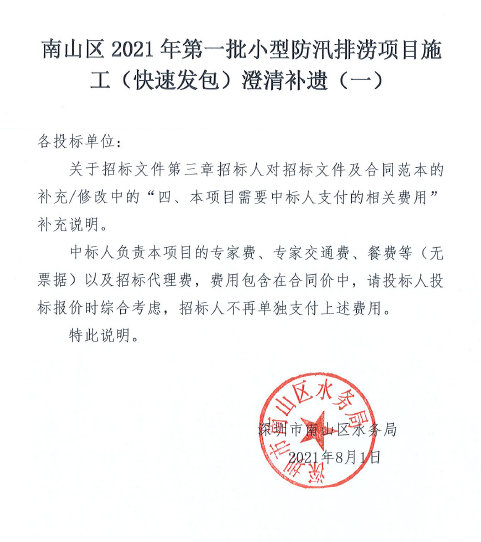 南山区2021年第一批小型防汛排涝项目施工(快速发包)澄清补遗(一)